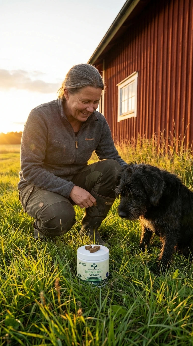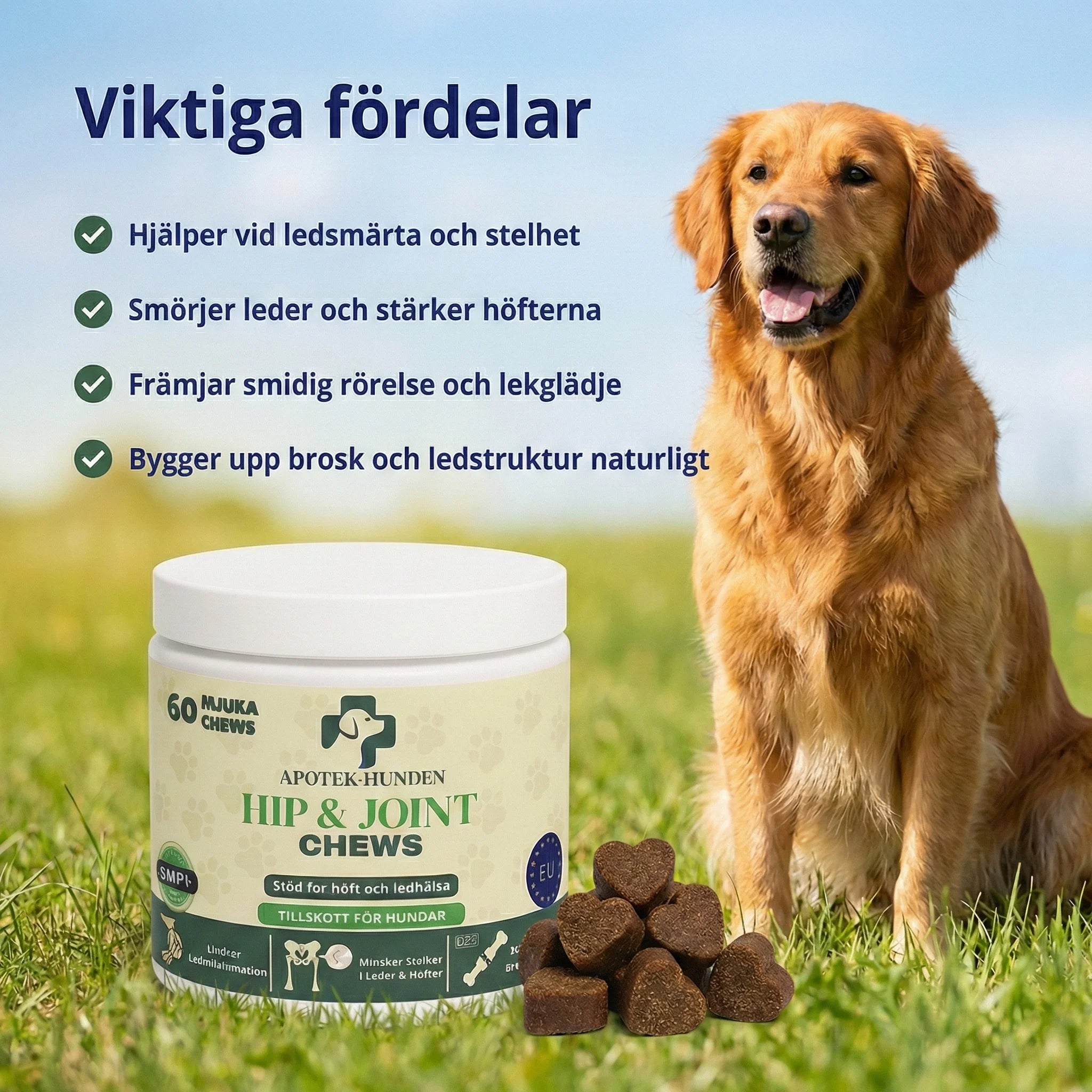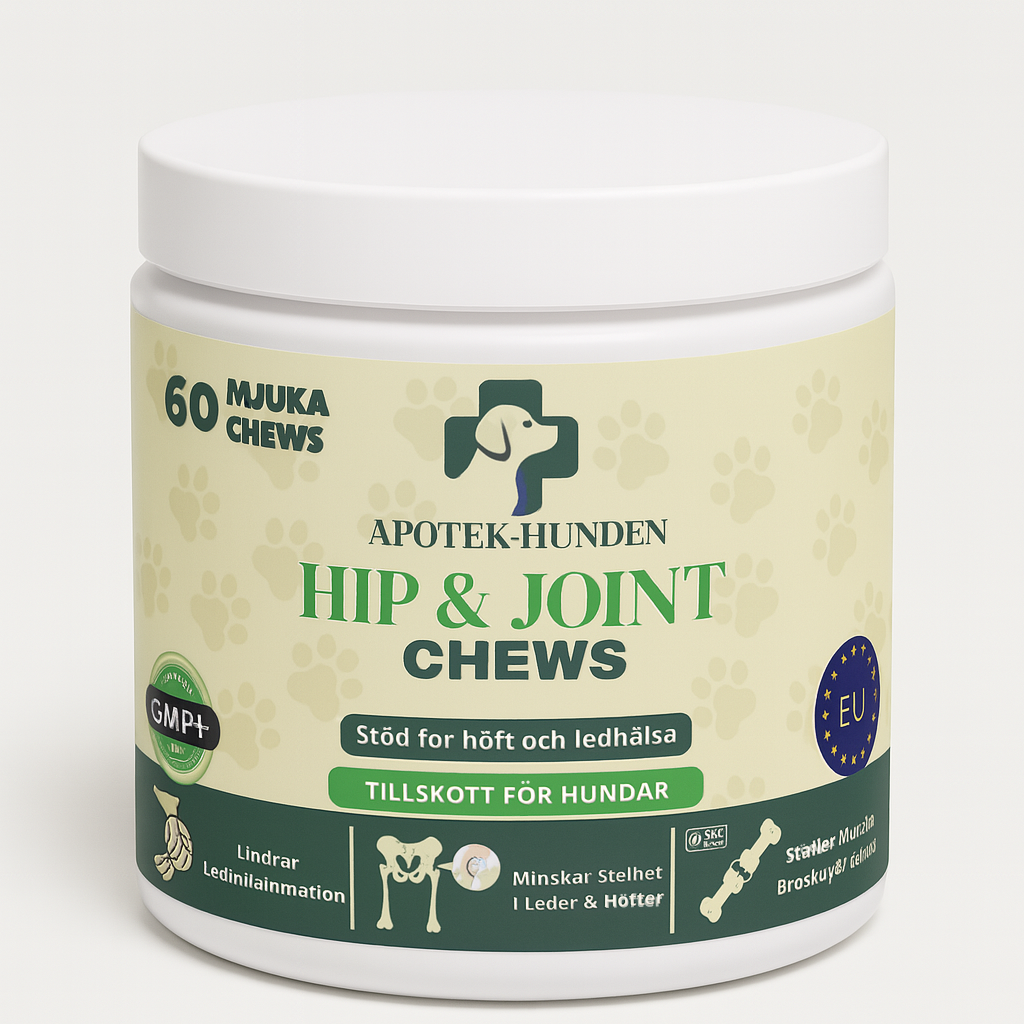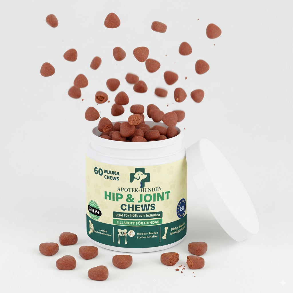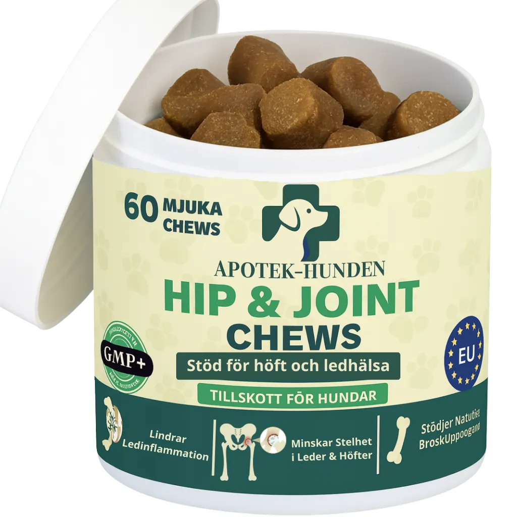 Inaktivert ølgjær, potetstivelse, vegetabilsk glyserin, potetflak, tørket eplemos, glukosamin (fra animalsk vev - krepsdyr), MSM (metylsulfonylmetan), raffinert kokosolje, tapiokamel, bovint kollagen, hydrolysert animalsk protein, johannesbrødkjernepulver, kondroitinsulfat, lakseolje, linfrøekspeller.